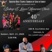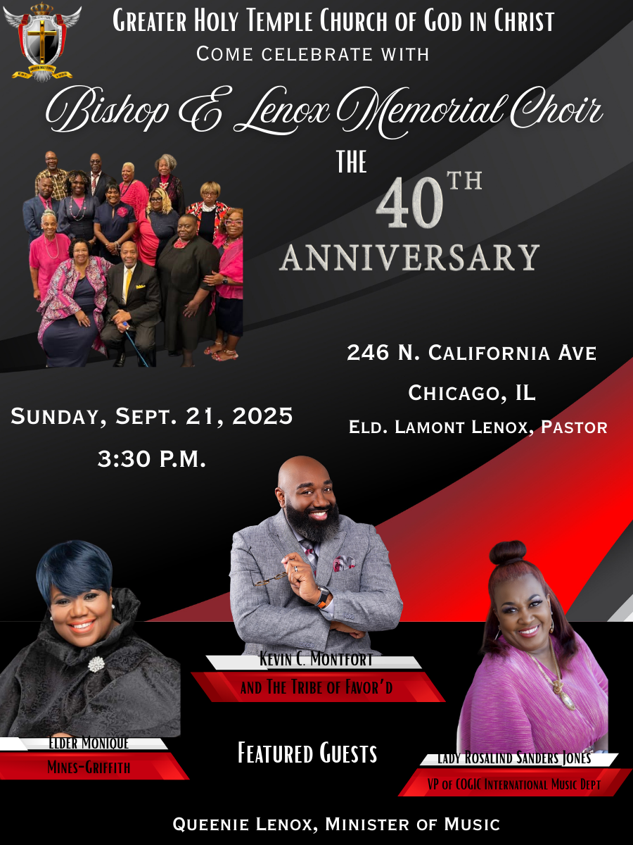 You Are Invited To Come And Celebrate The Bishop E. Lenox Memorial Choir 40th Year Anniversary! 40 Years Of Song and Praise To Our Lord God!! We Hope you Can Join Us!September 21, 2025, 3:30 pm Click Here For More Info |