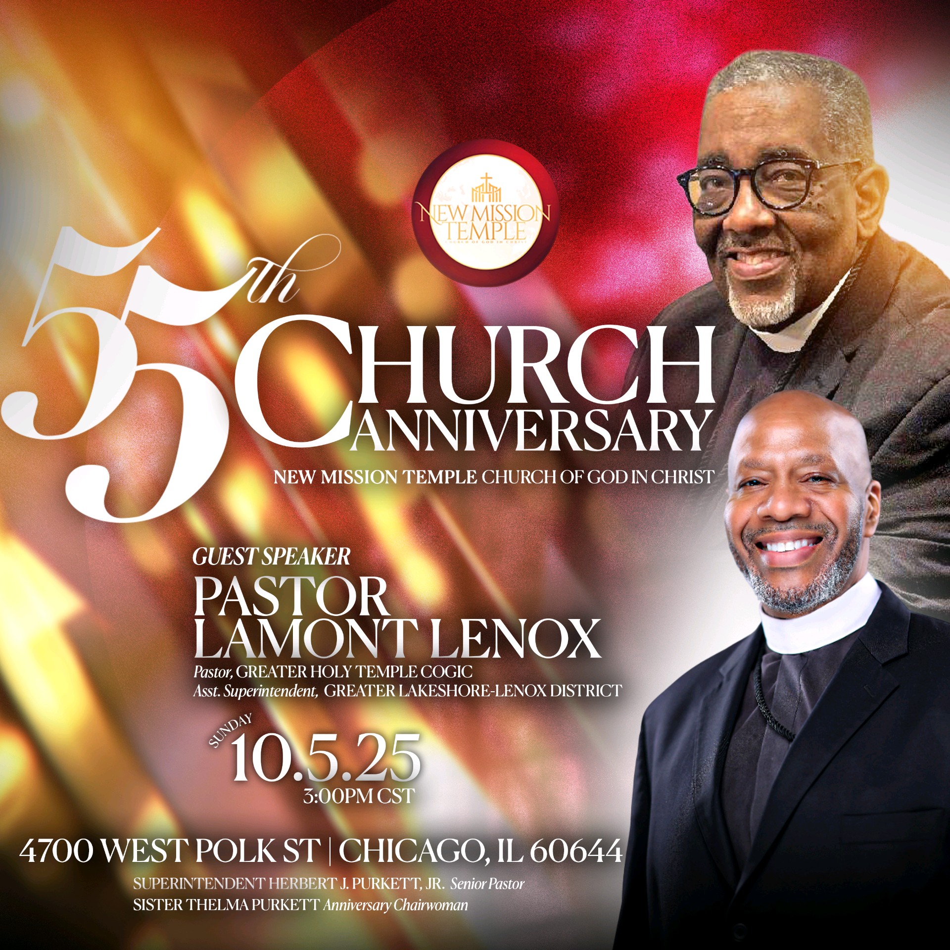 Pastor Lamont Will Be The Guest Speaker At New Mission Temple COGIC For Their 55th Year Church Anniversary Celebration. The Church Is Located At 4700 W. Polk Street, Chicago, IL.October 5, 2025, 3:00 pm You Are Invited To Join Us As We Celebrate With New Mission. Hope To See You There! Click Here For More Info |
